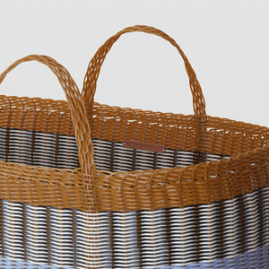 Tote Bag CollectionBicolor SeriesMercado ModelExtra Large SizeTobacco and Blue Lilac ColorCream Bottom100% plastic (polyethylene HDPE)Unlined37 cm height, 46 cm width, 23 cm depth, handles 12 cmHand sewed leather brand tag