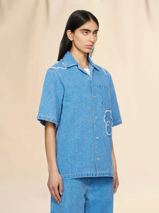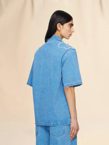 Short-sleeved polo shirt, made of organic denim coated with a washed effect. Loose fit with collar and buttoned closure. Finished with hand embroidered flower motif.